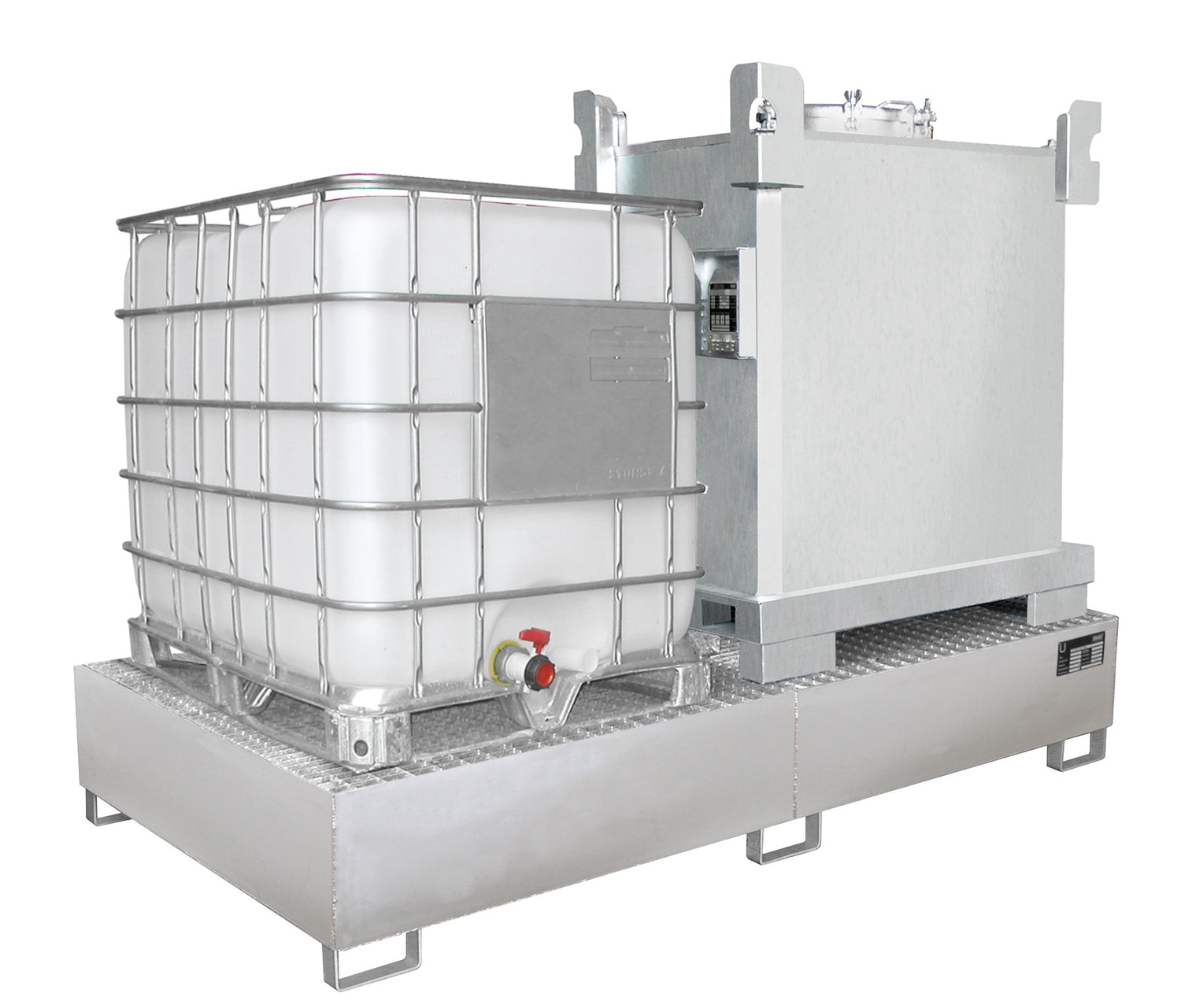 Lagerung von max. 4 Fässer á Liter oder max. 2 Container (IBC) á 1.000 Liter mit aggressiven Medien, auch mit 60l Fässer und Kleingebinden kombinierbar!